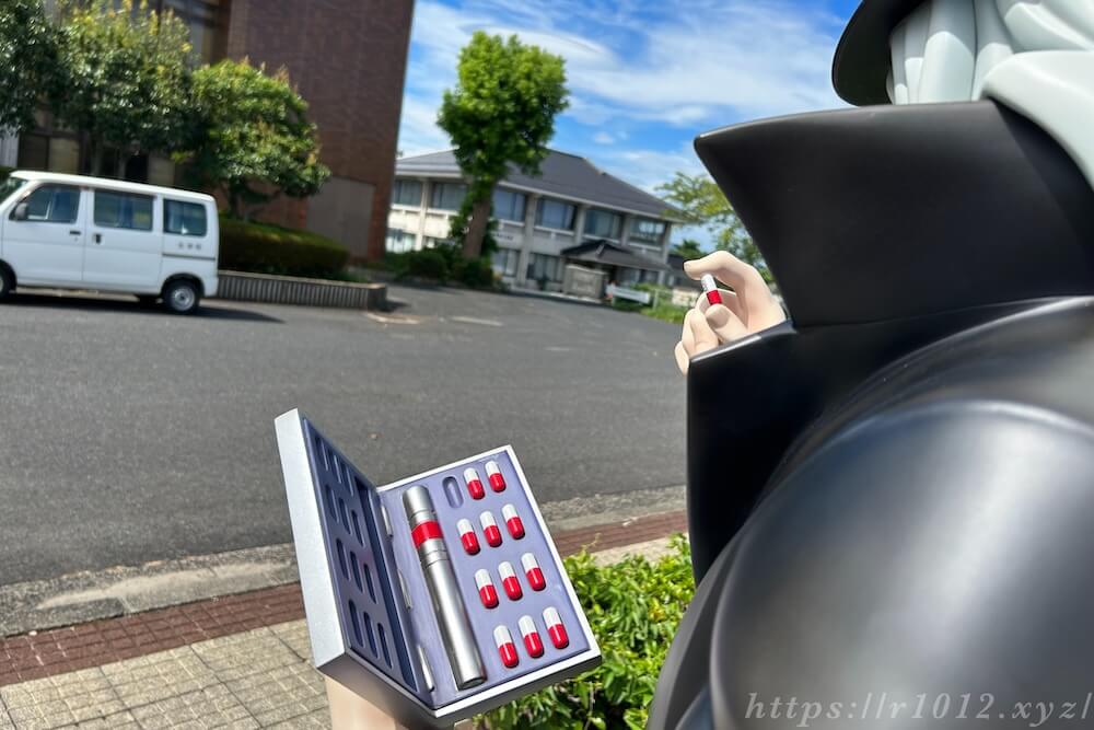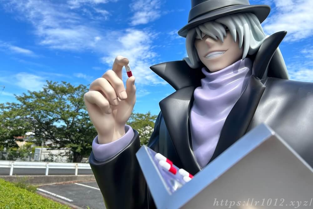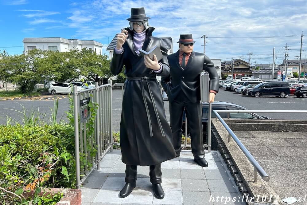 「小さくなった名探偵」オブジェのすぐ近くには黒ずくめの男の姿・・・