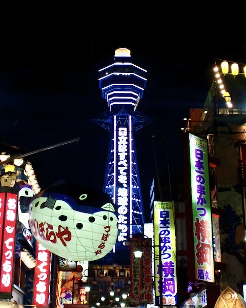 去年来たときは震災の影響でライトアップされていなかったですが今年はそのネオン姿を見ることが叶いました。ついでに大きなフグやら串カツの看板やらも撮れてめっちゃ“通天閣”って感じですww