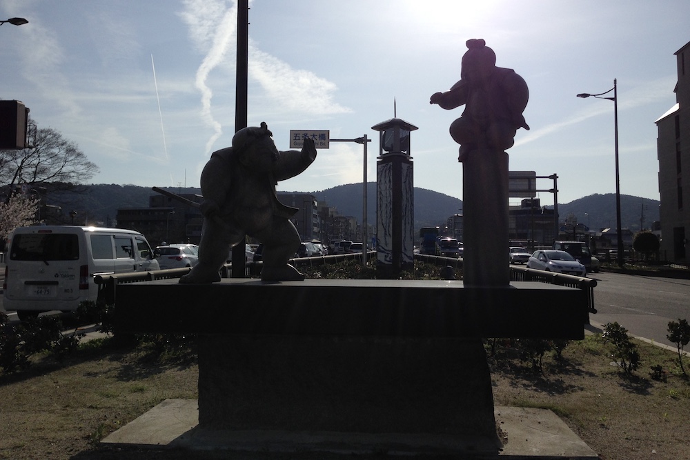 まず訪れたのは五条大橋です。〈迷宮の十字路〉巡りに牛若丸と弁慶の像を見に行きます。