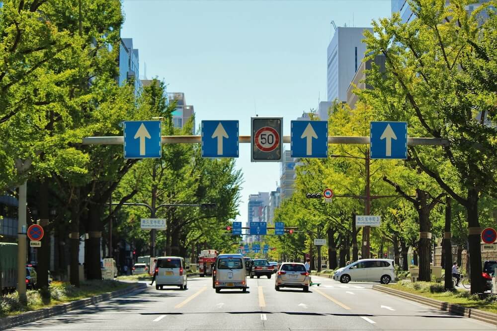 御堂筋は梅田から難波までの通りで平次の言うように一方通行です。6車線あるのにすべてが北から南への一方通行というなかなか珍しい通りのようです。