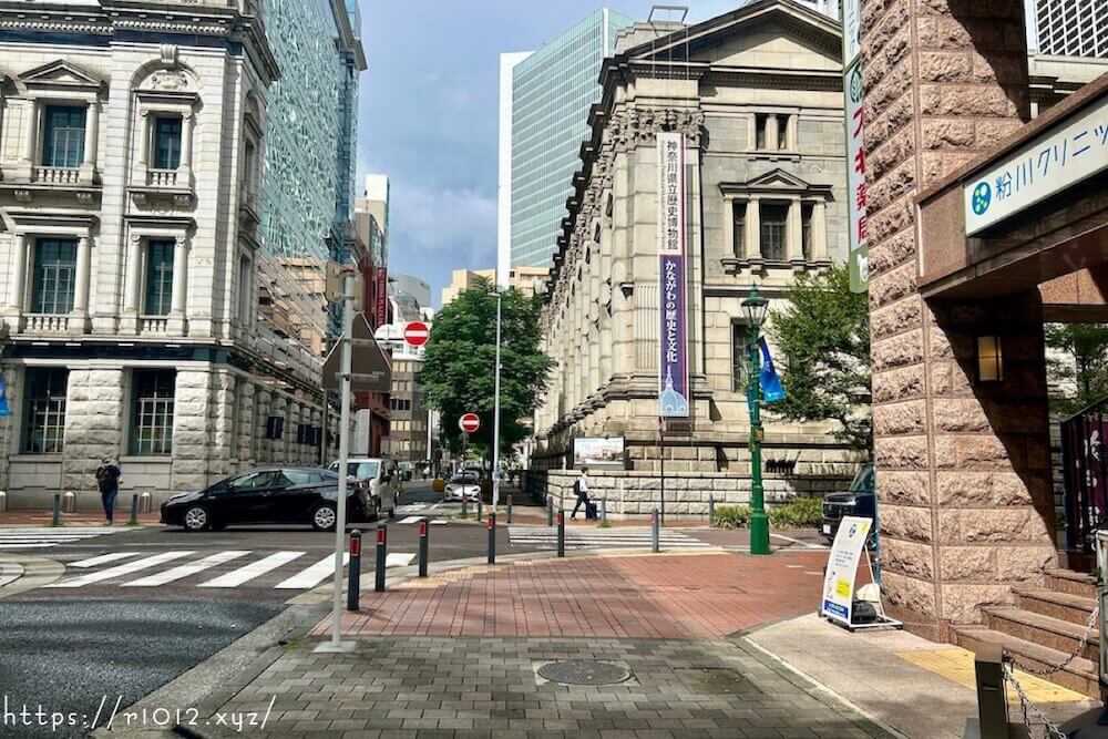 コナンが誰かの視線を感じて隠れたビルの隙間は『旧富士銀行横浜支店』と『馬車道大津ビル』の間ですかね。そこで平次と出会います。