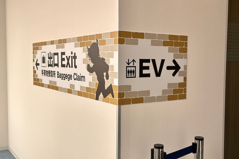 飛行機から手荷物受取所へ向かう階段前にあるコナンと蘭のイラスト。