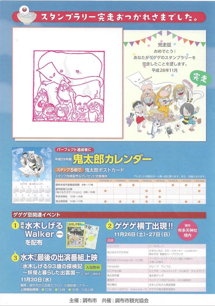 スタンプ5個で鬼太郎ポストカード、スタンプ完走で2017年の鬼太郎カレンダーが貰えます。