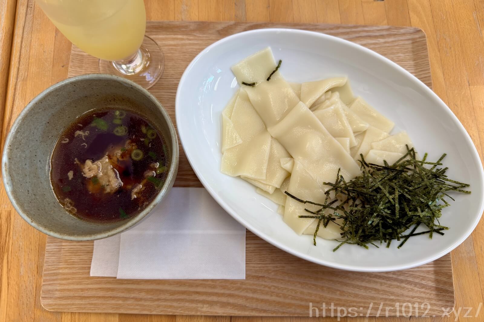 お目々がついて一反もめんのようになった幅広麺のうどんです。牛肉入りつけ麺です!美味しかった!