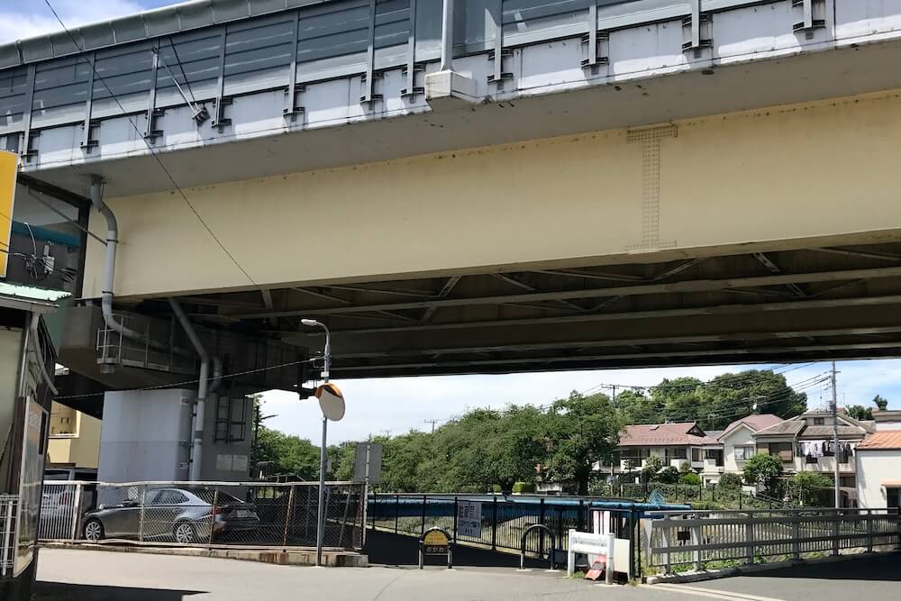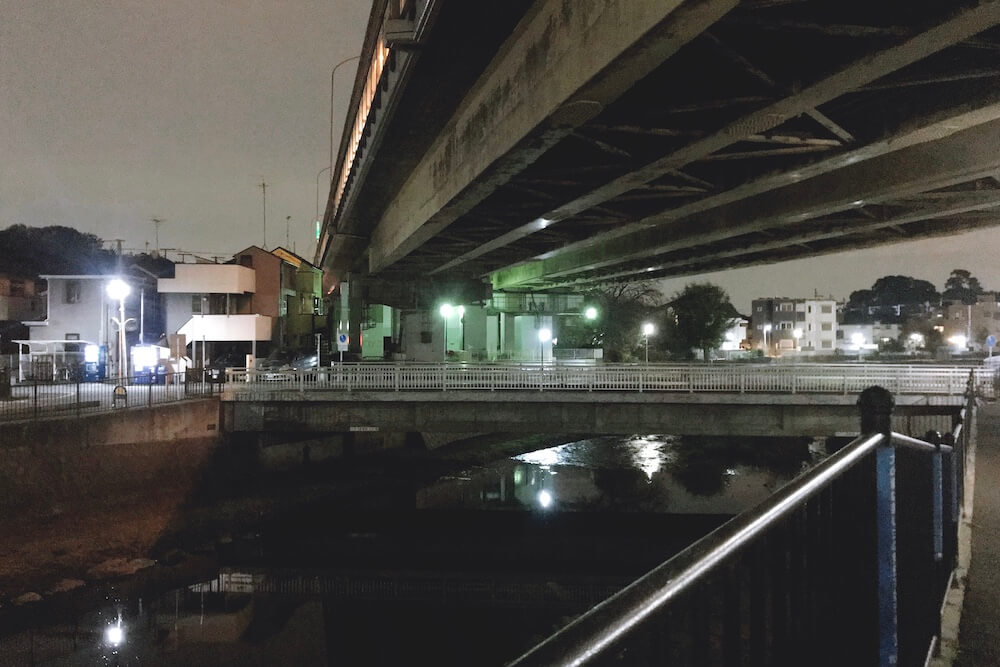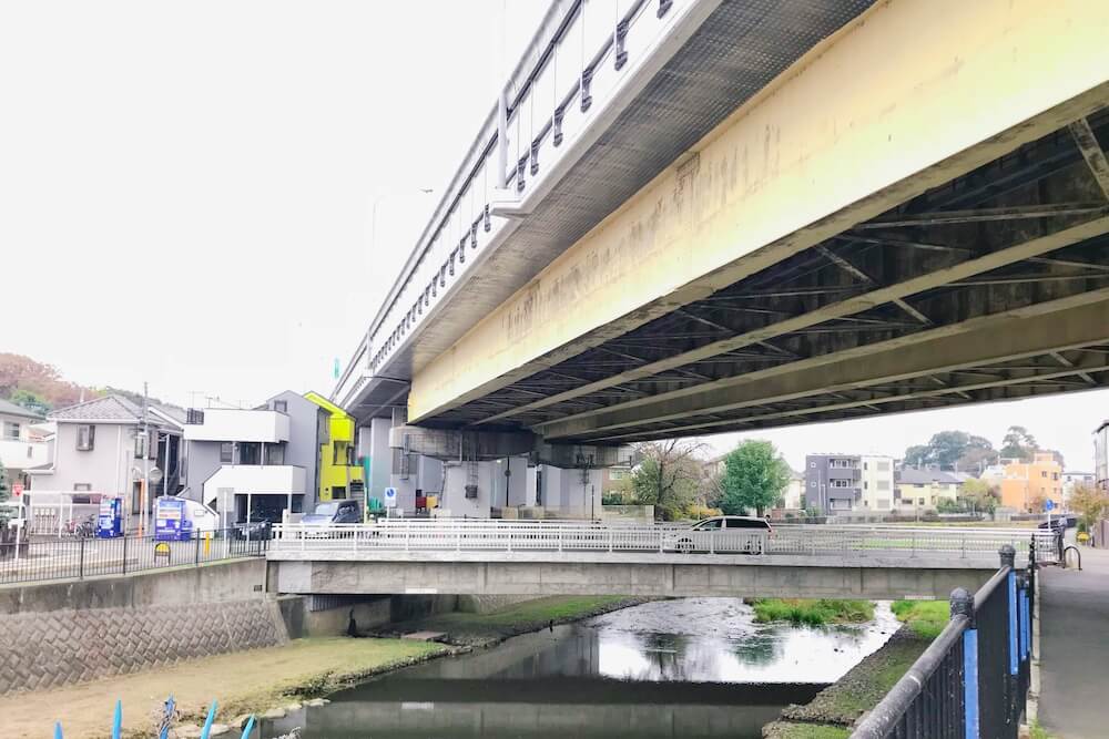 まなが下校途中友人らと別れた場所。調布の野川に架かる『橋場橋』の南側です。上に映るのは『中央自動車道』です。
