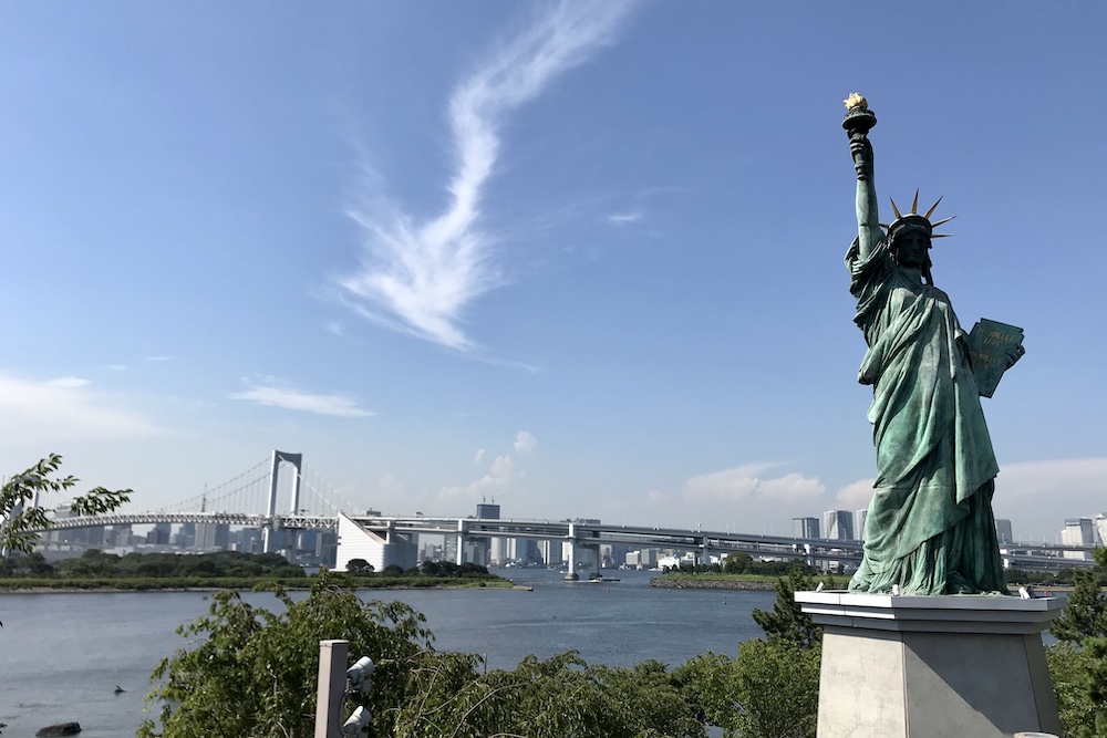 お台場海浜公園にある自由の女神像。『レインボーブリッジ』も一緒に見ることができます。