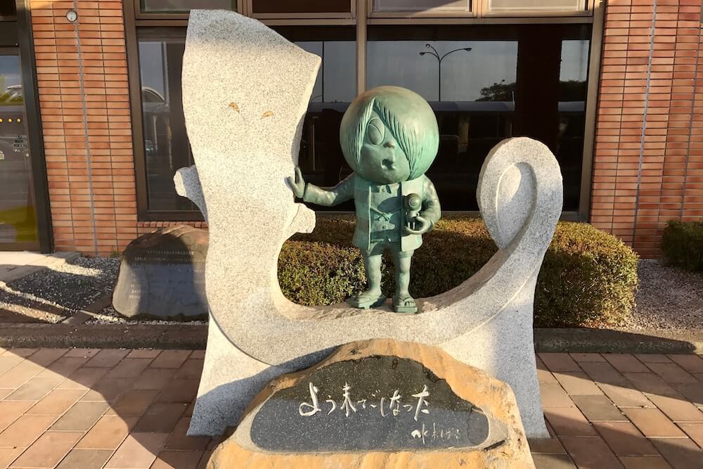 この鬼太郎像のデザインは水木さんによるもので「よう来てごしなった」は「ようこそおこしくださいました」の意味です。