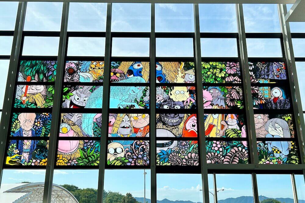 吊り下げオブジェと同じ2階到着ロビーには巨大なステンドグラス「妖怪たちの森」があります。
