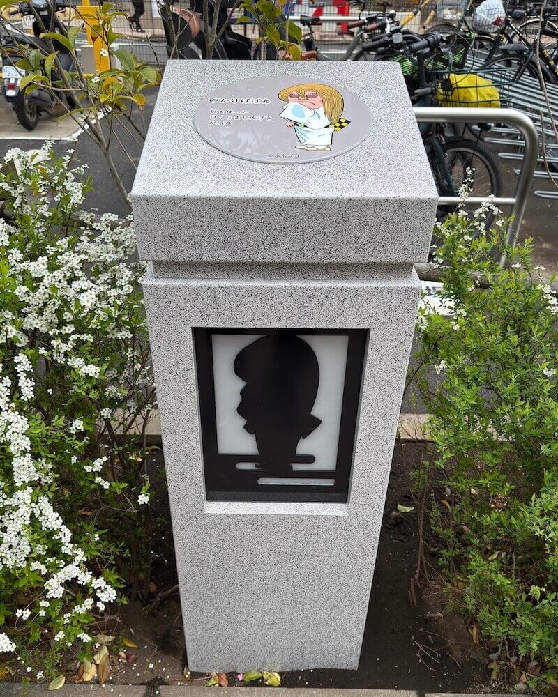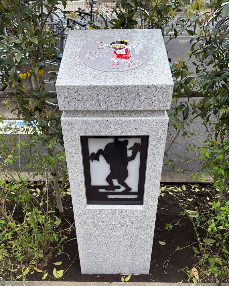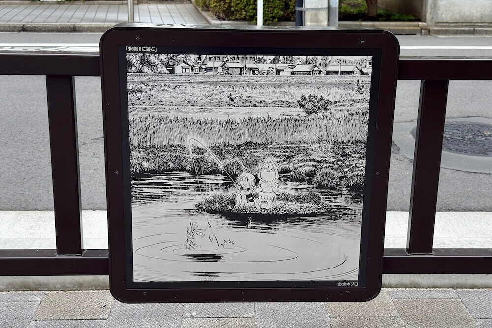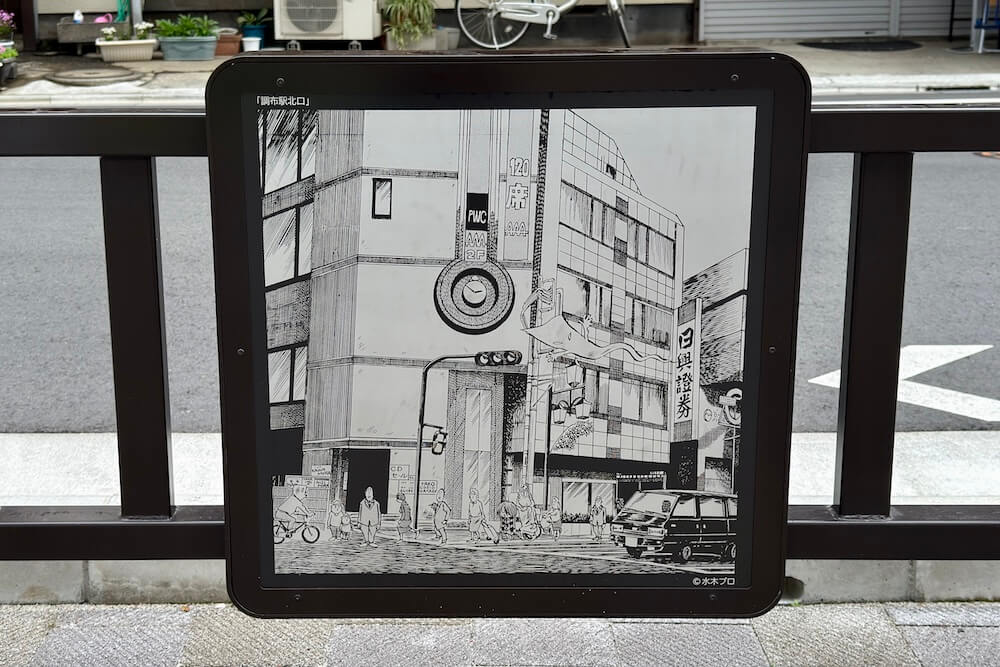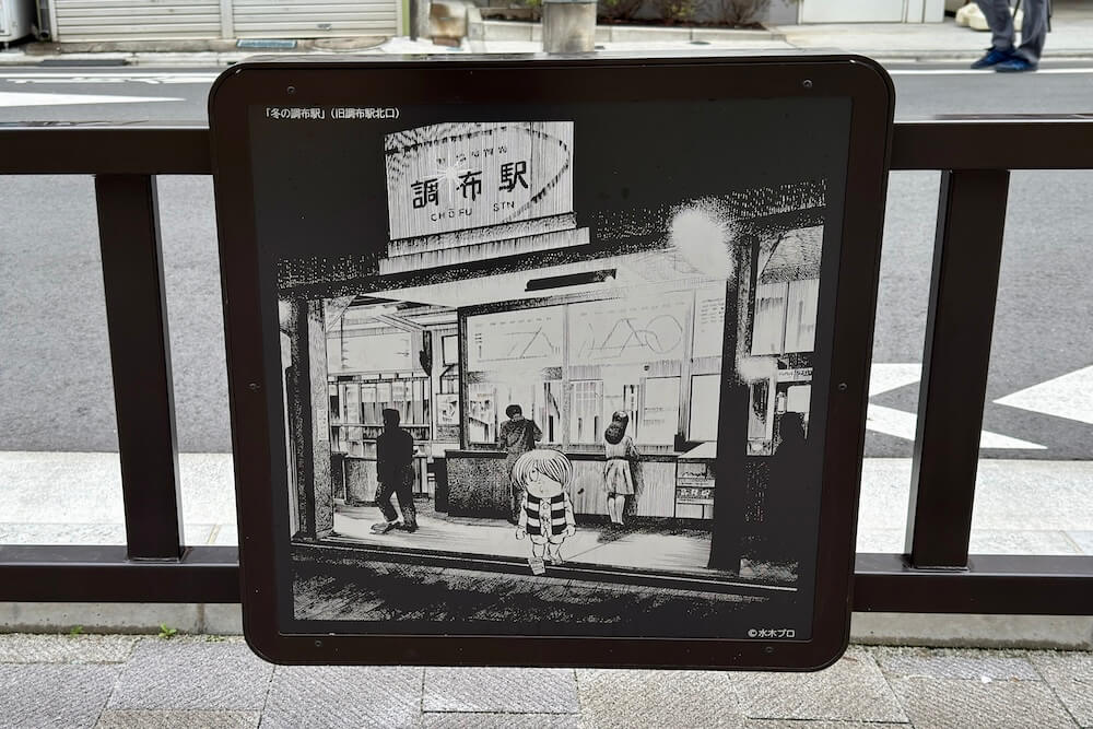 調布駅側から歩くと、イラストパネル・キャラクター照明・ブロンズ像といった3種類のキャラクター装飾が並んでいます。