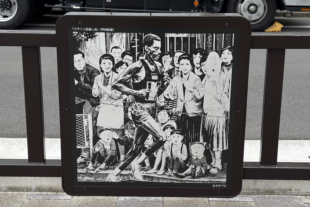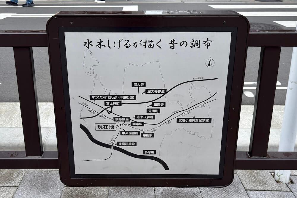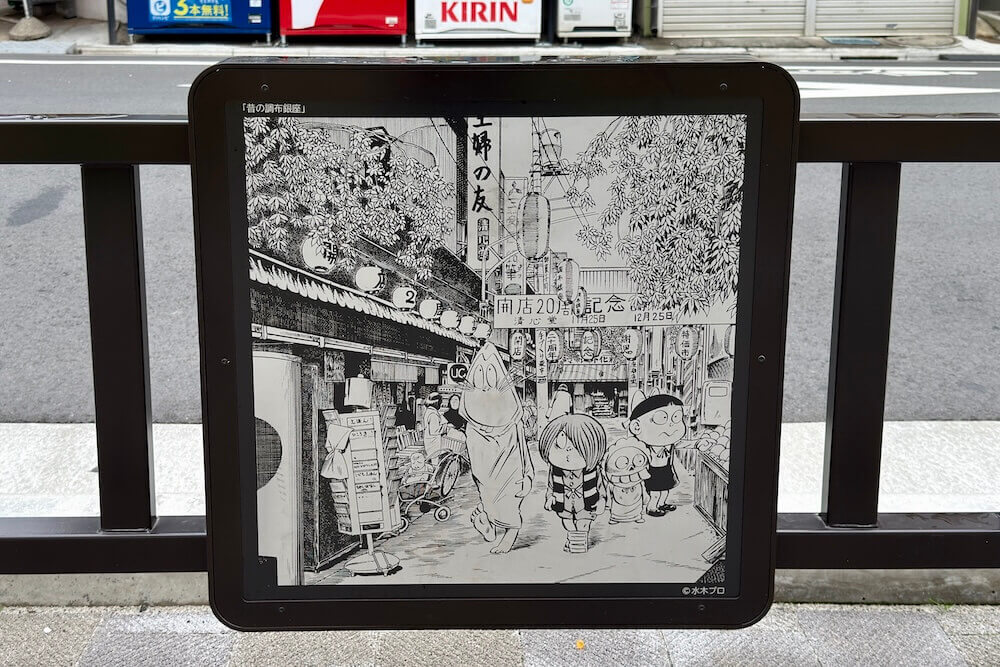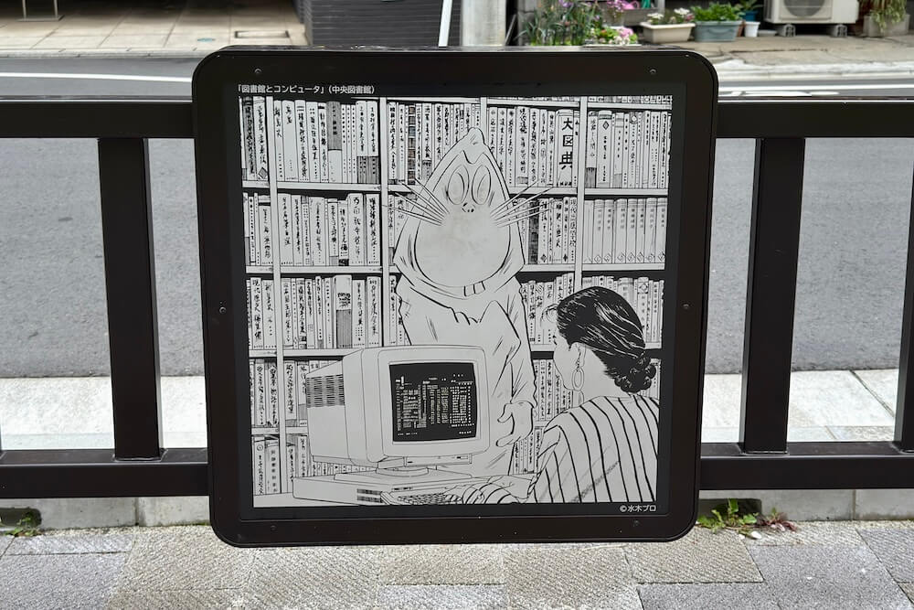 これらは、水木さんが調布の「図書館だより」の表紙として描いたイラストを使用しており、調布の街に鬼太郎たち妖怪が溶け込む様子が描かれています。