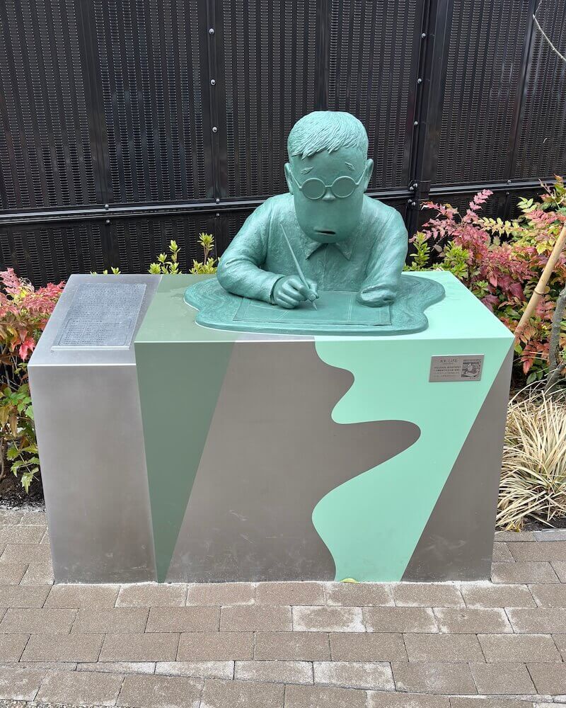 『ゲゲゲの鬼太郎』の「朧車」のお話に登場するワンシーンをもとにした、水木さんのブロンズ像。この台座横には寄附者名盤もあります。
