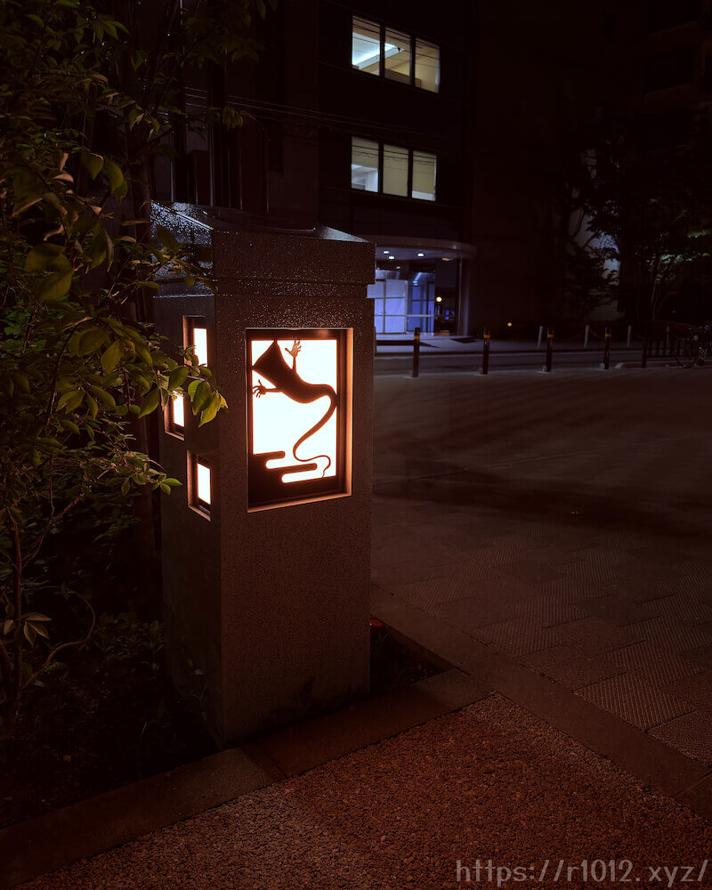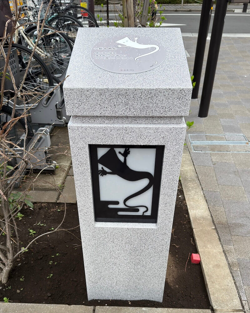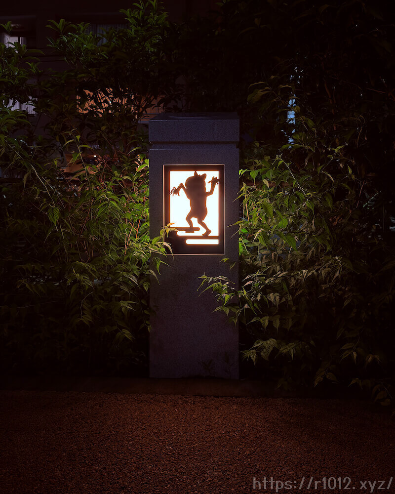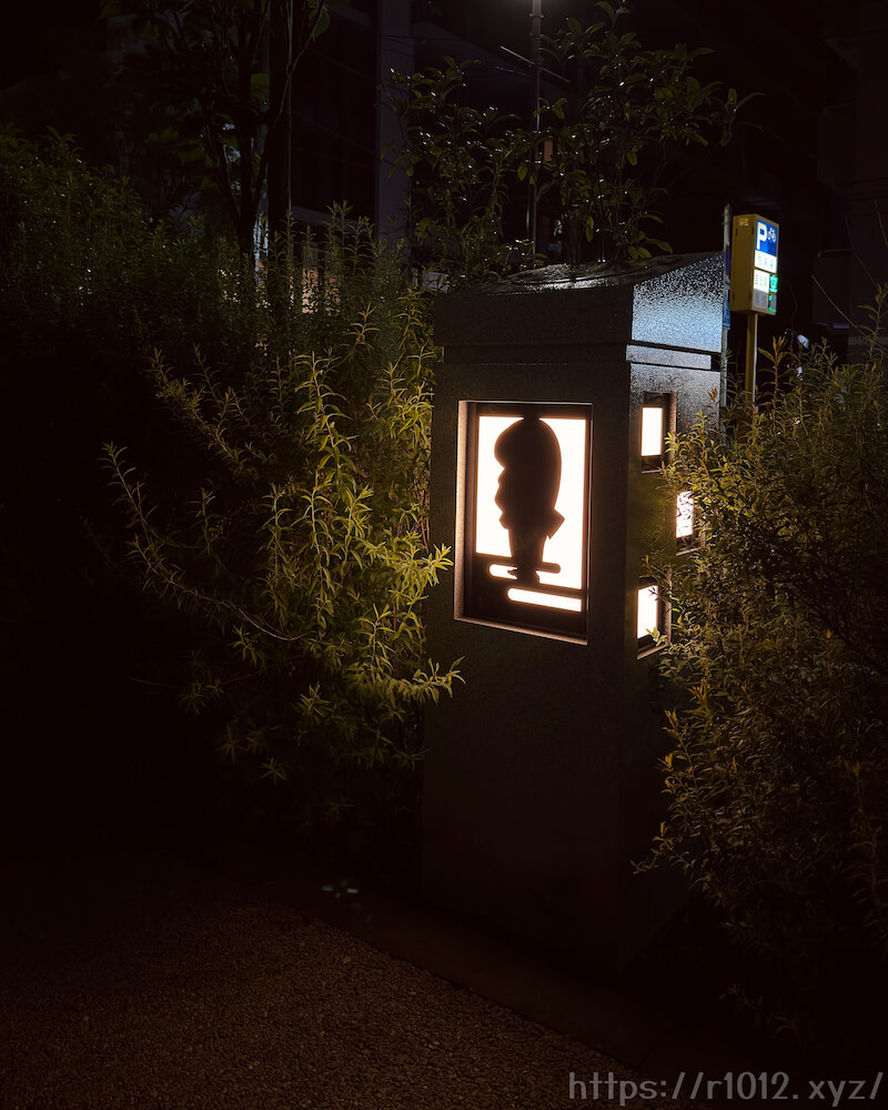 トリエ横の歩道を抜けた先、駐輪場脇にはキャラクターシルエットが浮かび上がる照明が4基設置されました。
