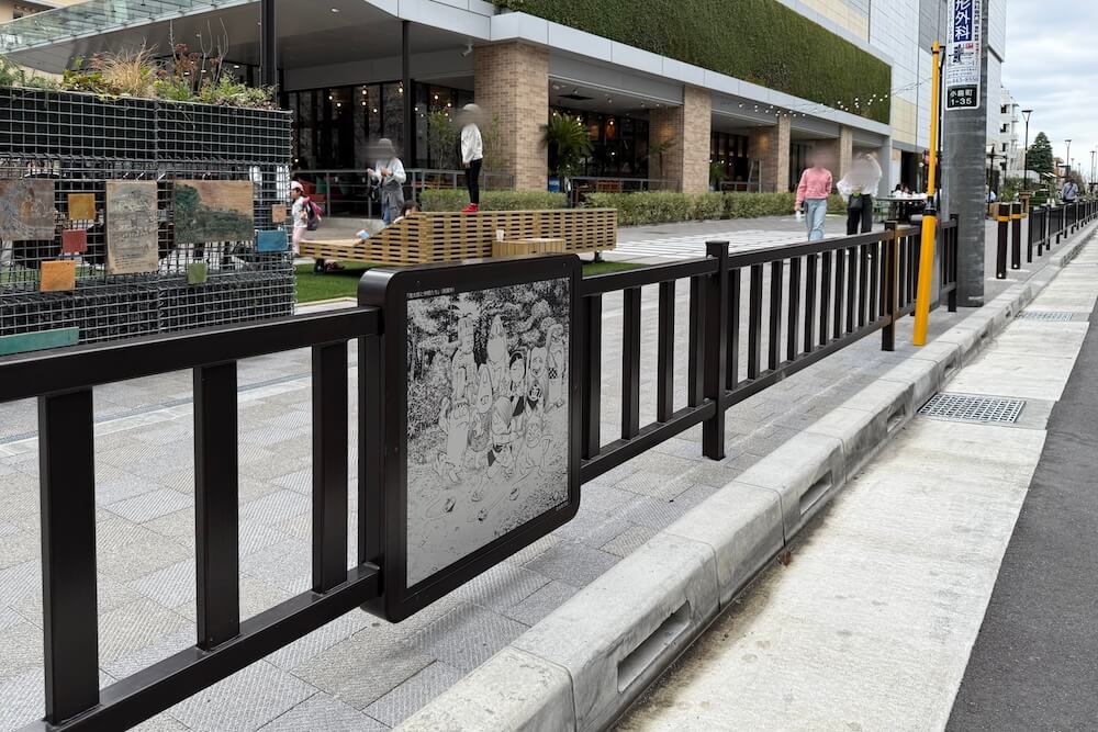 トリエ京王調布C館建物沿いの歩道セーフティフェンスには、全20種のイラストパネルが埋め込まれています。