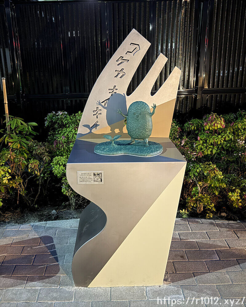 4つの死期の迫った命が合体して誕生した妖怪『コケカキイキイ』のブロンズ像。