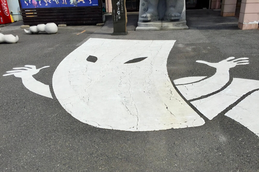 そしてまさかの足元にいるのは一反もめん。一反もめんのヒラヒラが車止めの目印になっているようです。