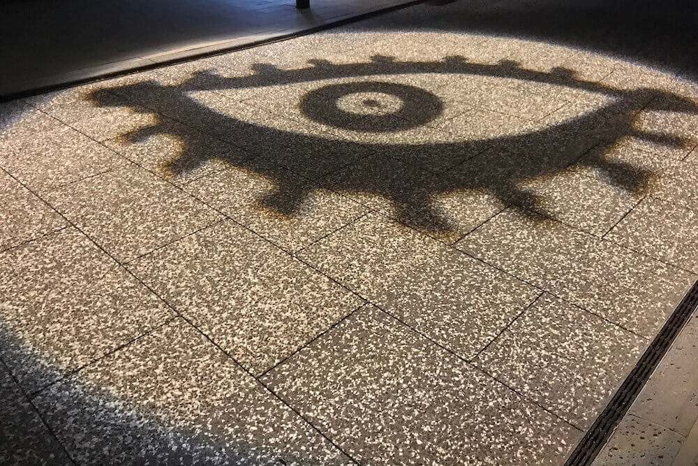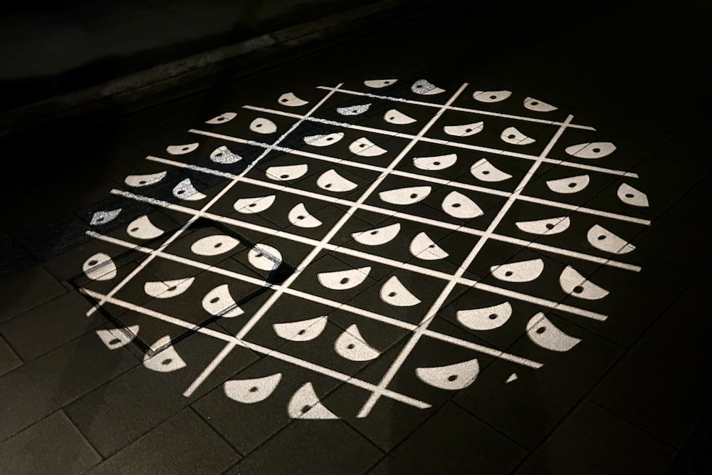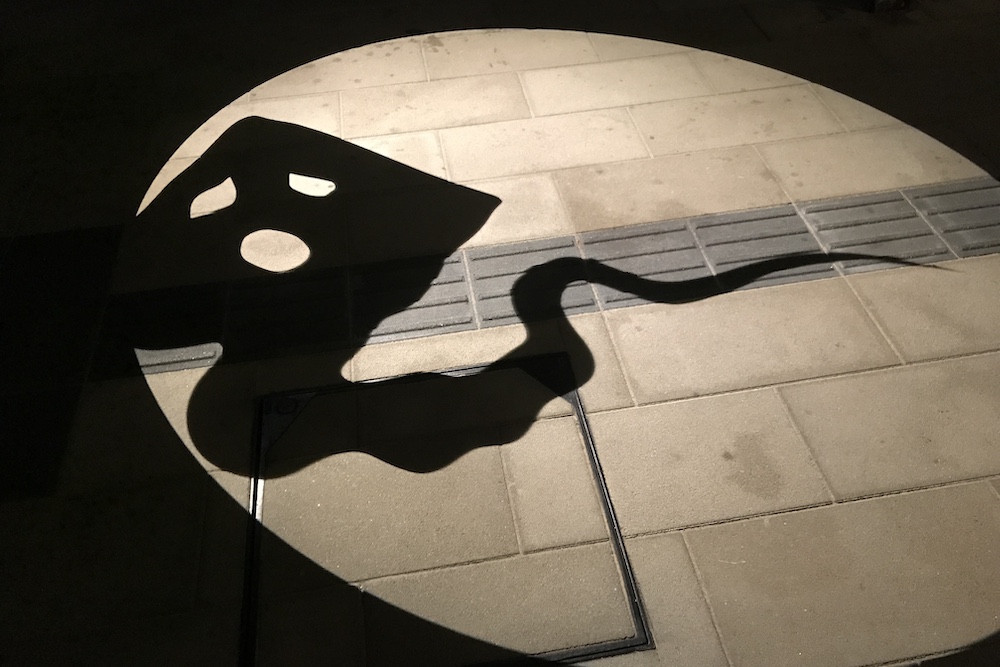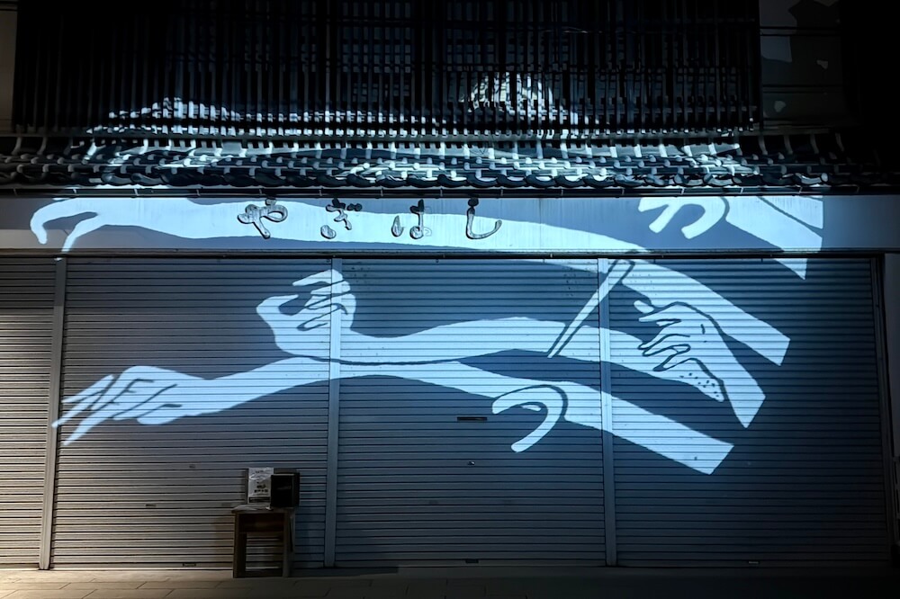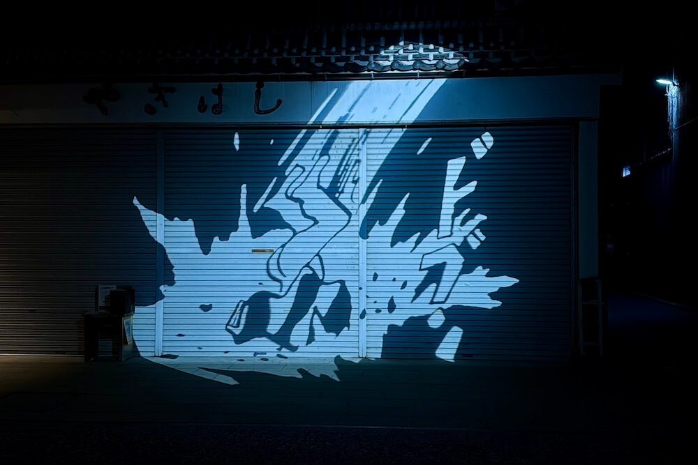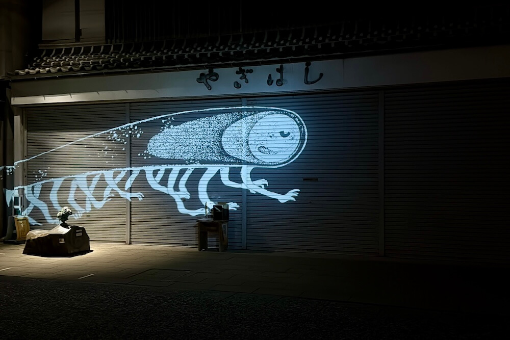 2020年8月、水木しげる記念館周辺に出現!15分毎(8分間点灯、7分間休止)に、影が縦横するように動く投影です。