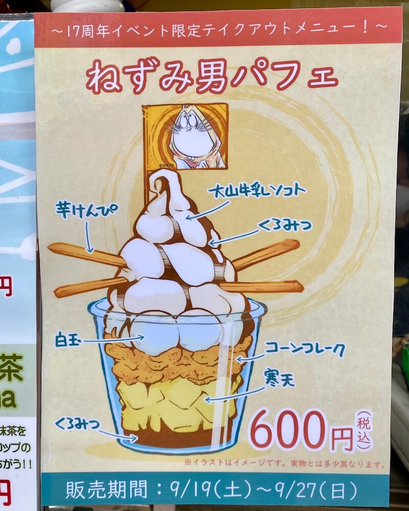 鬼太郎茶屋17周年イベント🎉 2020.09.19 イベント期間 2020年9月19日〜27日 17周年おめでとうございます!!今年はお店の臨時休業もあってなかなか行けなかったけど周年イベント開催できてよかった〜! 鬼太郎とねずみ男がやってくる 19日〜22日、26日、27日 11時・13時・15時 毎年とにかく可愛いが満点〜! 今回は感染対策かグリーティングの撮影は距離を保ってとなりました。 17周年限定パフェ 大山牛乳のソフトクリームやコーンフレークなど茶屋サンデーがベースになっていますがソフトクリームに突き刺さった“芋けんぴ”でねずみ男のヒゲを再現ww ※テイクアウト限定メニューです 17周年限定グッズ グラス マルシェバッグ 17周年ロゴの入ったグラスの丸みのあるデザインがめちゃかわ! ショップ2000円以上購入でステッカーが貰えます!ははは ギャラリー無料開放 現在の展示内容:「ビビビのねずみ男展」 📸「ビビビのねずみ男展」鬼太郎茶屋妖怪ギャラリーただのアルバムページ。「ビビビのねずみ男展」期間:2020年3月7日〜2021年3月2日