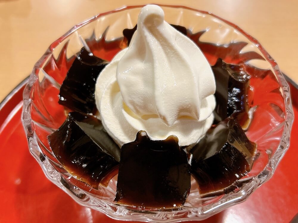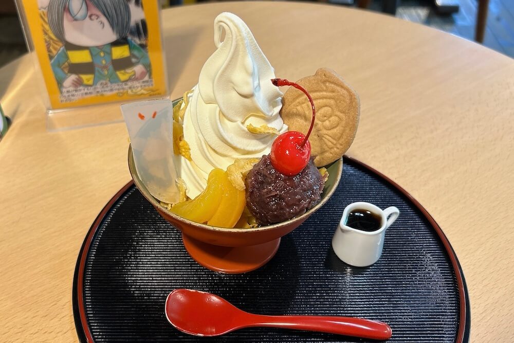 ほろ苦いコーヒーゼリーと甘いソフトクリームがベストマッチです。ぬりかべの形をしたゼリーが可愛い!