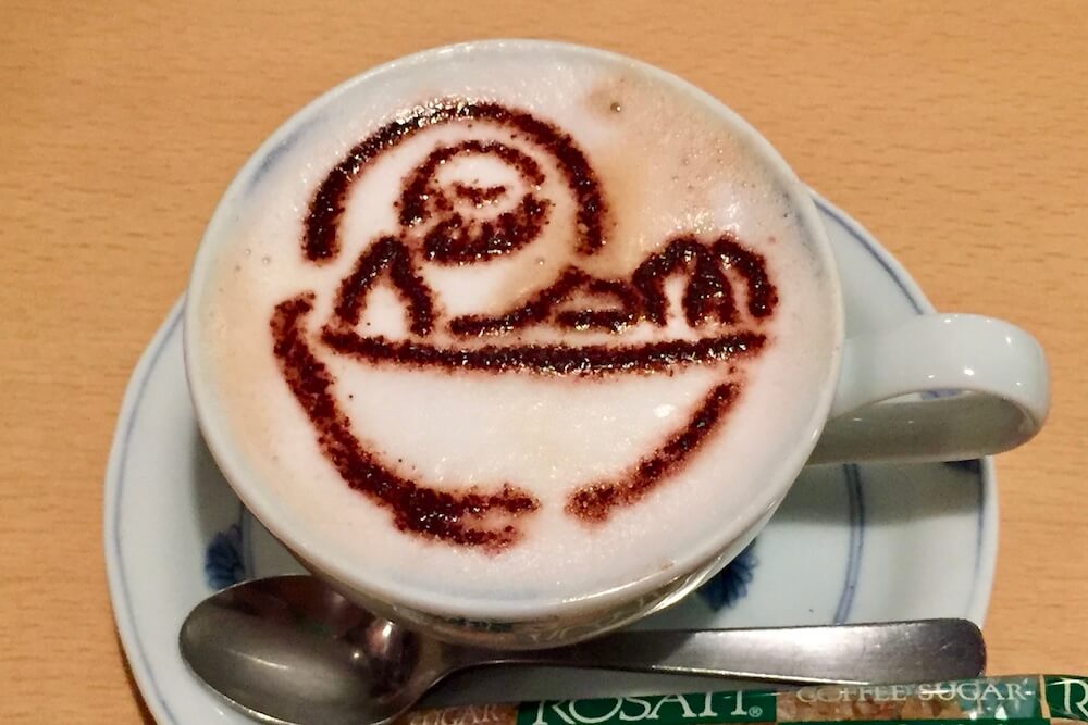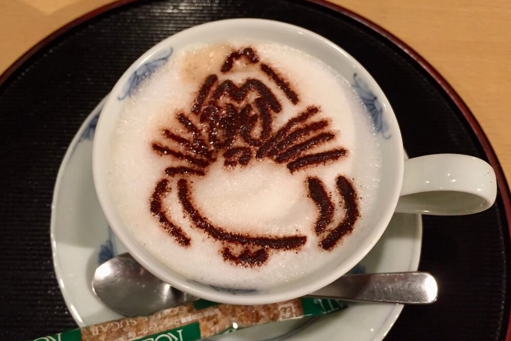 ラテアートの入ったカフェラテ。鳥取県のお水と白バラ牛乳が使われています。