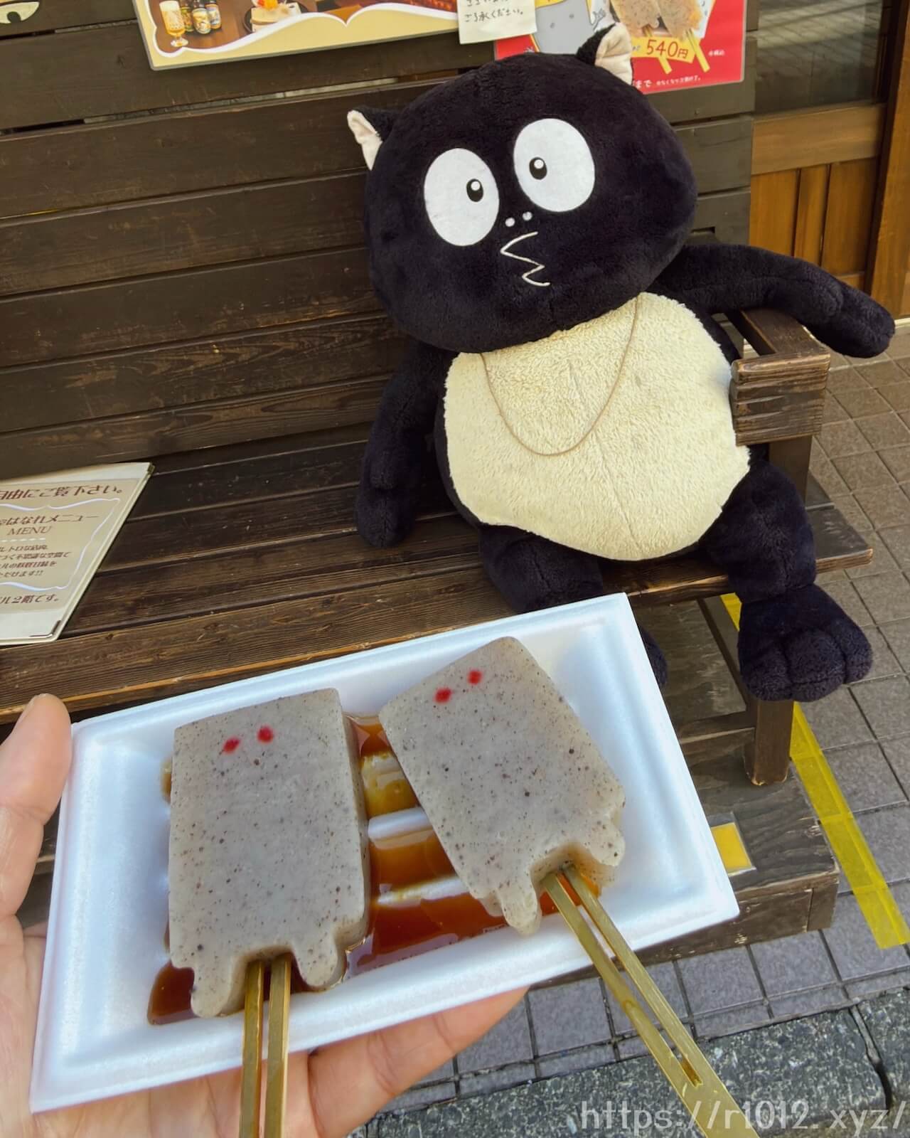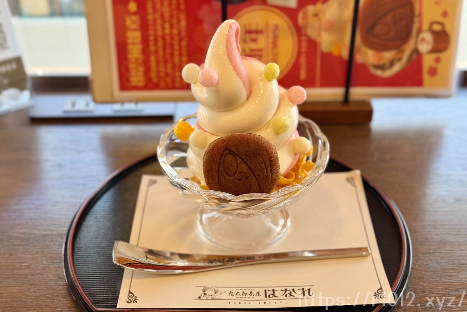 “おいり”がトッピングされたソフトクリーム。鬼太郎の人形焼のキャラクターはランダムだそうで目玉おやじやねずみ男もいます。
