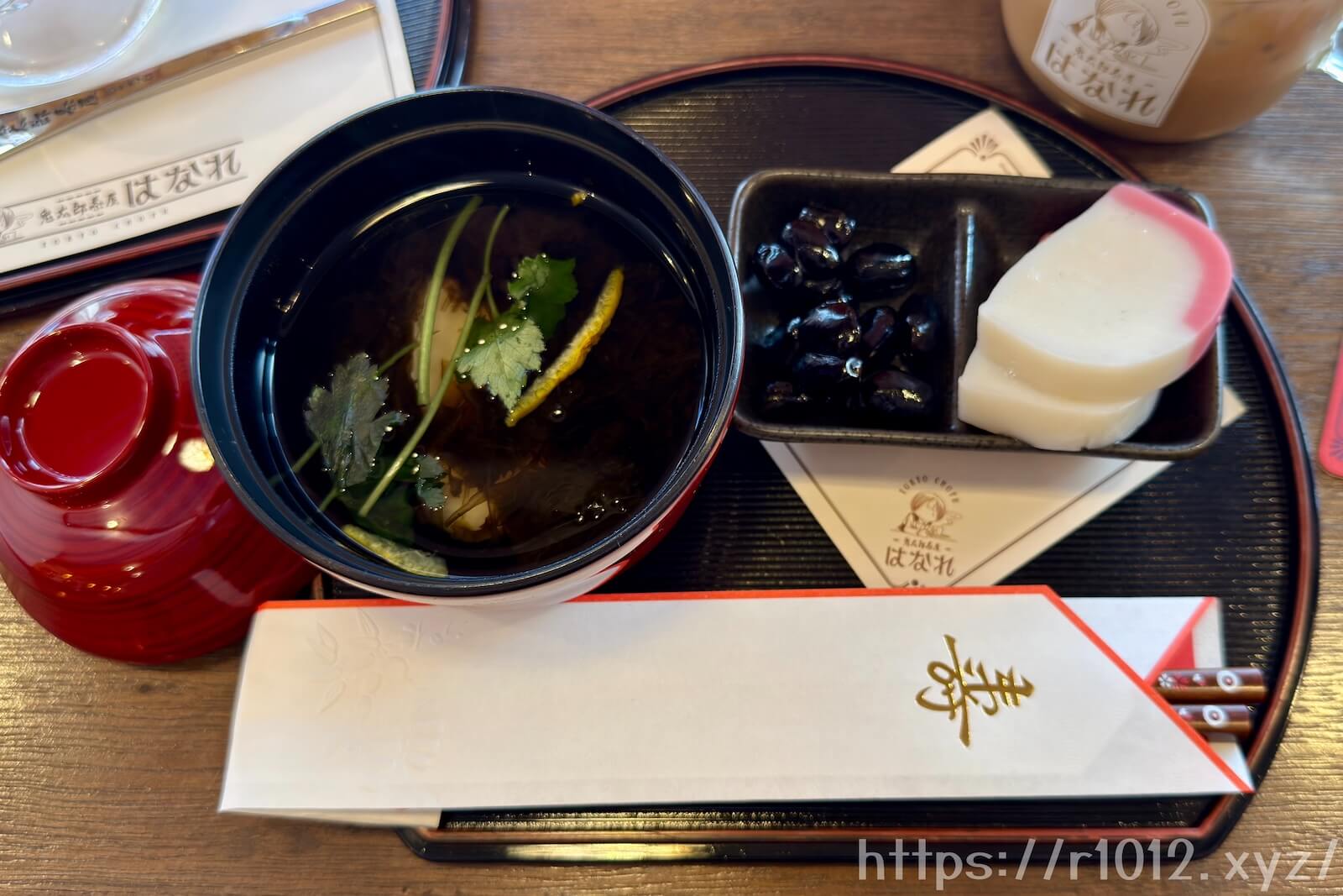 十六島海苔を使用した雑煮。小さなお餅が3つほど入っています。黒豆とかまぼこ付き。