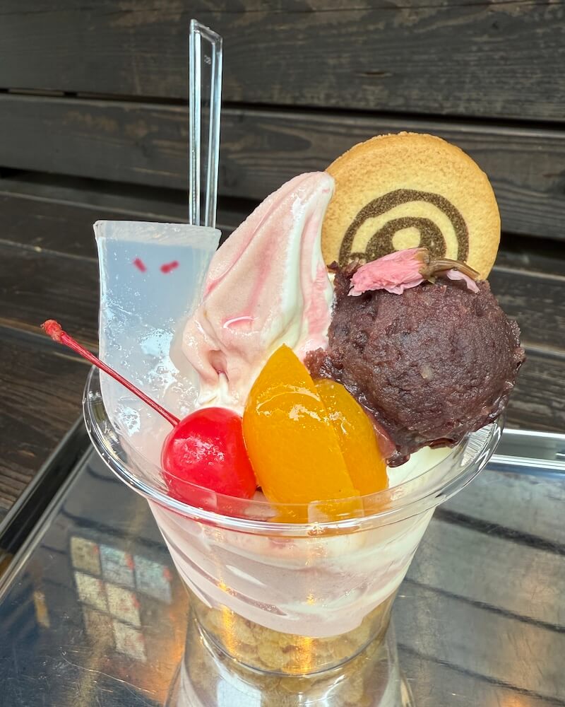 桜ソフトと牛乳ソフトがミックスされたサンデー。