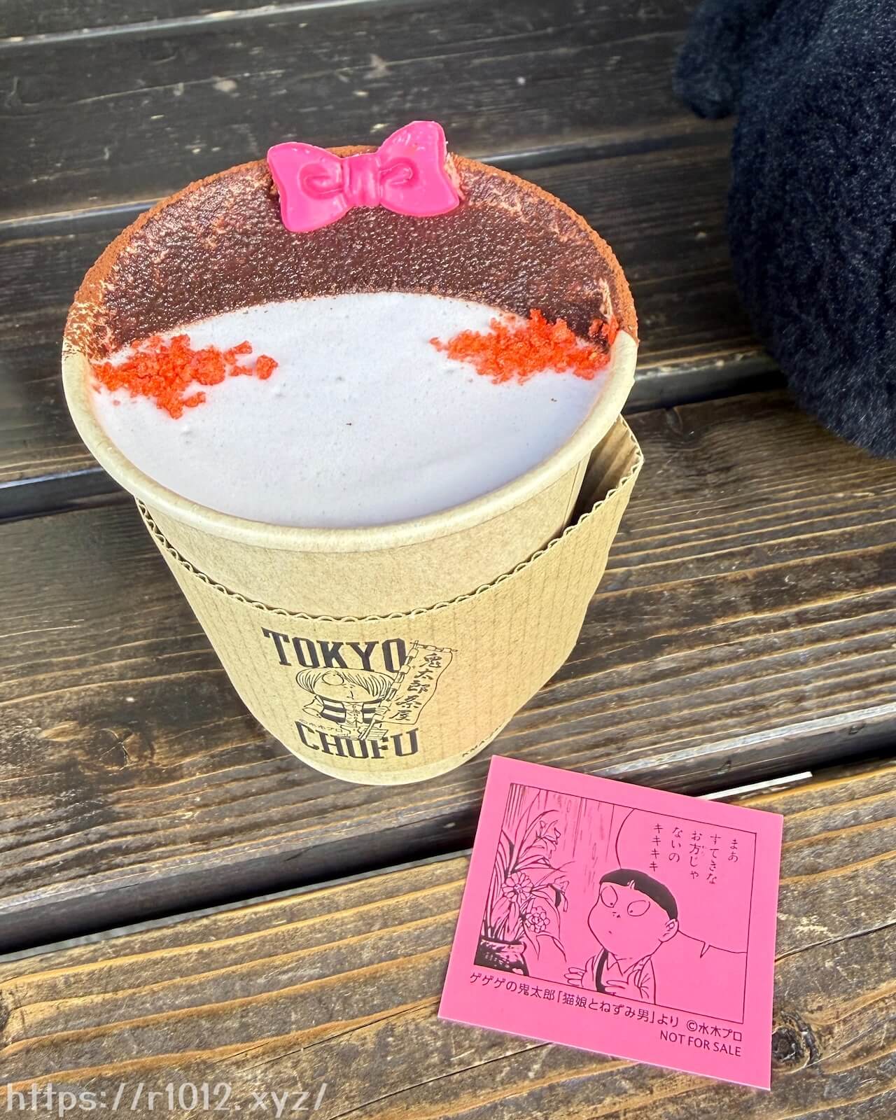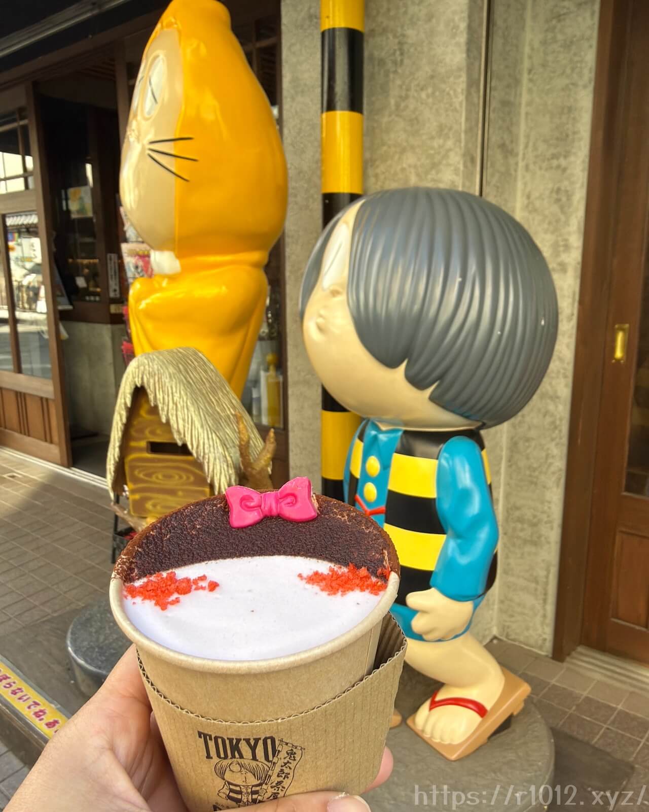 バレンタインメニューのねこ娘ラテ+通常のゲゲゲラテのねこ娘アート、そして最近喫茶でお気に入りメニューの百目の子あんみつを注文しました。もはやどっちがこの日の主役やら……